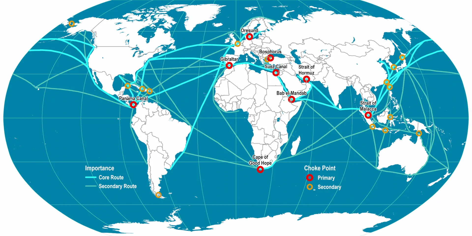 Entre los pasos más críticos se encuentran el Canal de Panamá, que conecta los océanos Atlántico y Pacífico, y el Estrecho de Malaca, que une el Mar de la China Meridional con el Océano Índico.